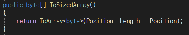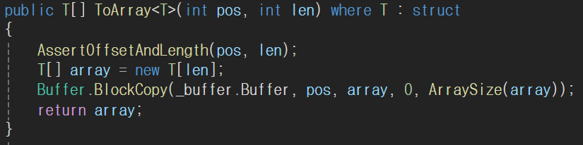 그리고 ToArray함수 내부에는 new로 배열을 새로 할당한 뒤 BlockCopy로 딥카피를 해준다.