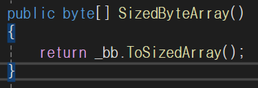 그래서 직접 FlatBufferBuilder 클래스의 SizedByteArray를 타고타고 들어가 보았다.
