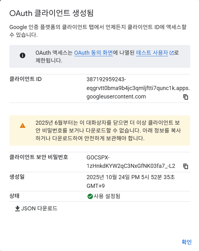 생성되고 나면 일단 json 다운로드를 해준다. 나중에 클라이언트 비밀번호가 필요하게 될 수도 있으니 구글 드라이브든 어디든 안전한곳에 저장해두자