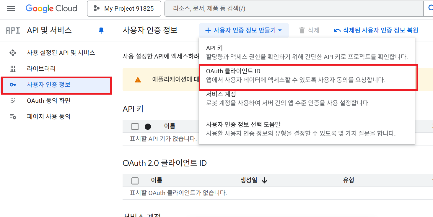 그 다음 구글 클라우드에 프로젝트를 설정해준다.